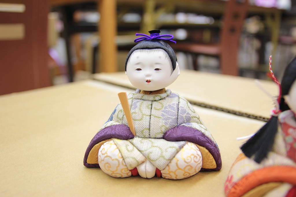コロンとかわいいお顔をイメージして彫刻しました。 胡粉を何度も何度も塗り重ねて、江戸時代からの伝統の技術により表現しました。 きれいなシルクの復元織の衣裳も素敵な雛人形です。