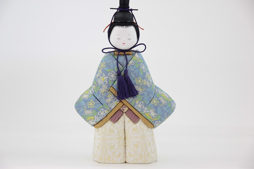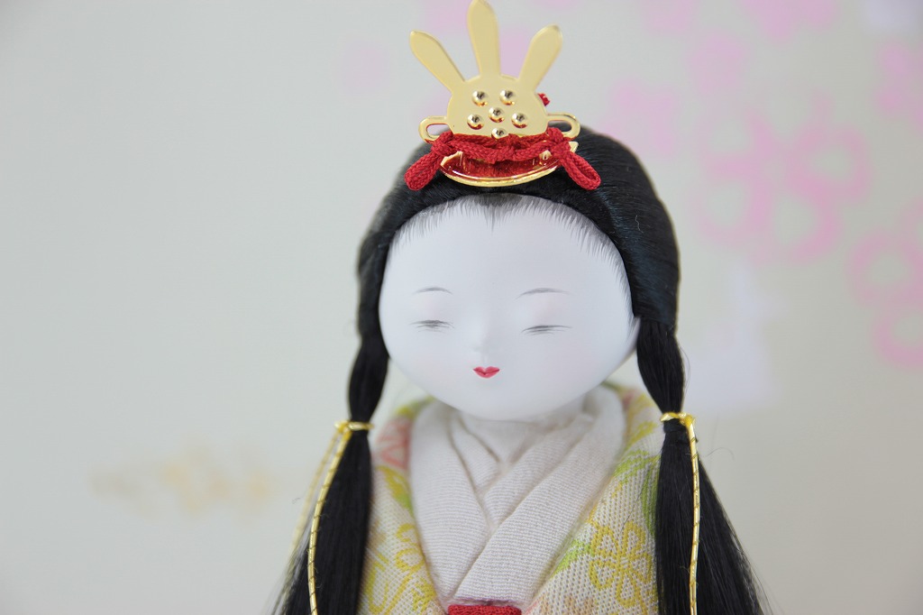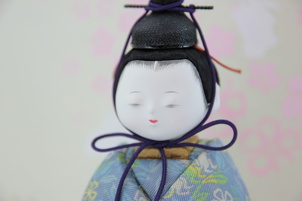 江戸時代からの伝統の技術で制作したお顔です。 目は、筆と墨を使用した書目の表現です。 胴は木目込人形となっておりまして、生地には高級な龍村美術織物の生地を使用しています。