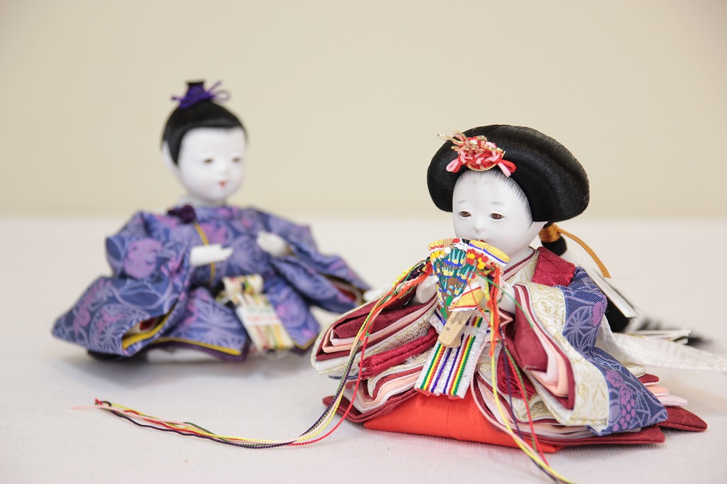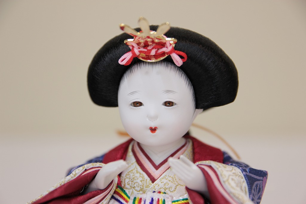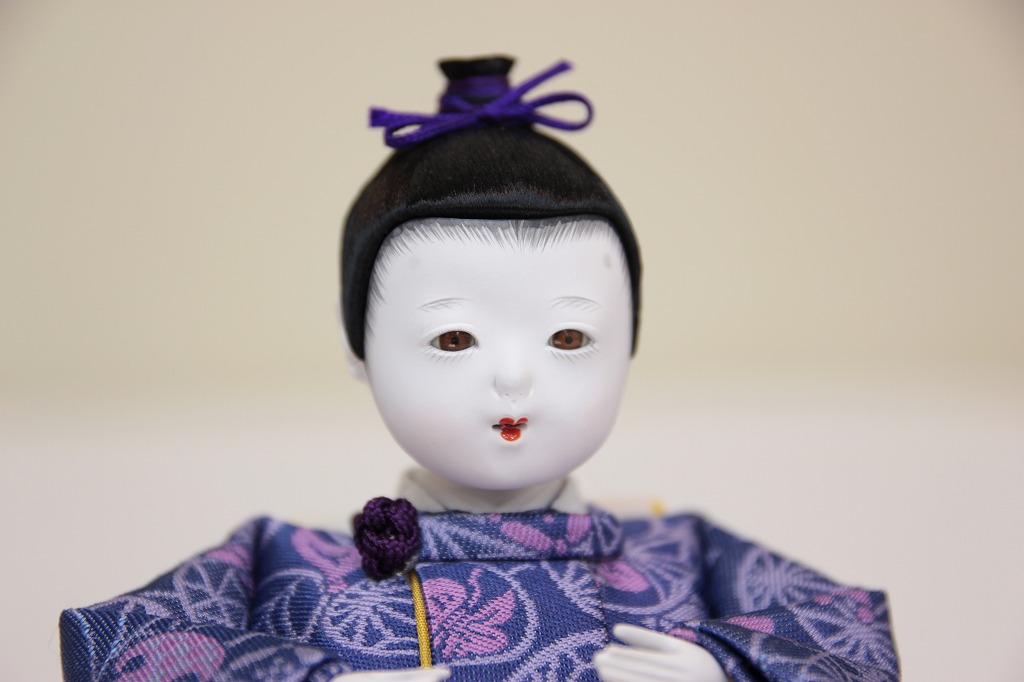全国的にも大変珍しい、江戸時代からの技術で制作した桐塑頭のおぼこひな人形です。 ふっくらとしたかわいいお顔です。 紫の龍村美術織物の着物も素敵です。