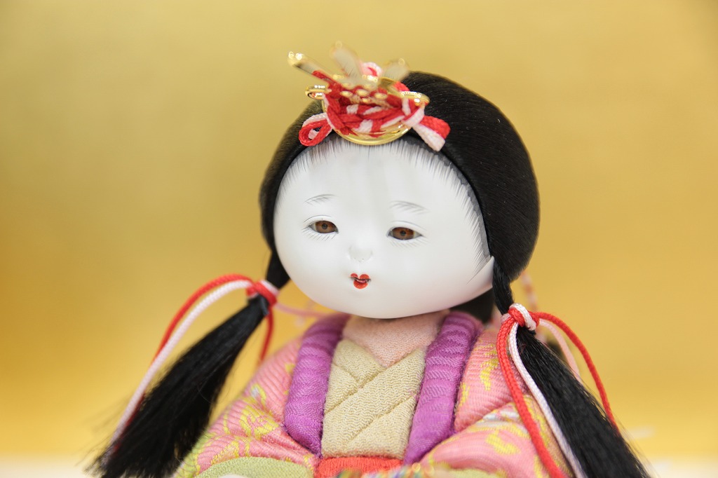 江戸時代から伝わる桐粉や貝殻の粉を使用して制作した世界に一つの雛人形です。 お顔は、胡粉を10数回塗り重ねて仕上げておりますので、あたたかく、深みもあるお肌に出来上がります。 ボディーは木目込み人形です。 衣裳の生地には、上質なシルクを使用し鮮やかに出来上がりました。