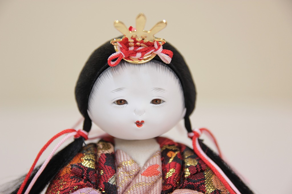 伝統工芸士が制作した手のひらサイズのかわいい木目込み雛人形です。 お顔は、伝統の桐塑頭です。 西陣織金襴を使用した衣裳は大変発色が良く鮮やかに出来上がりました。