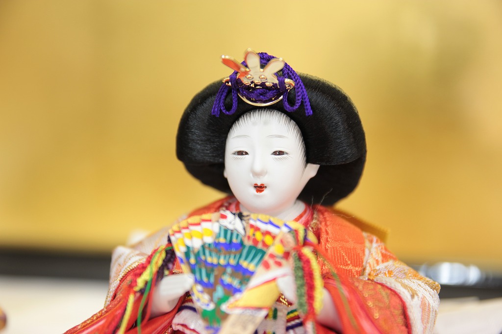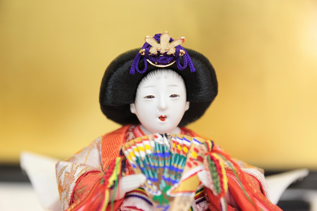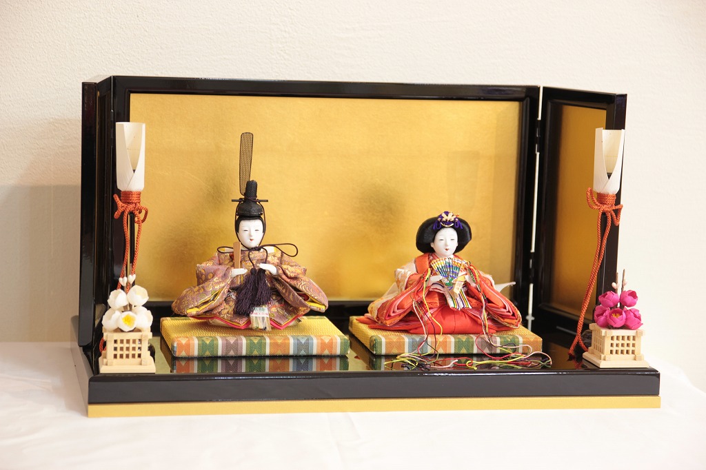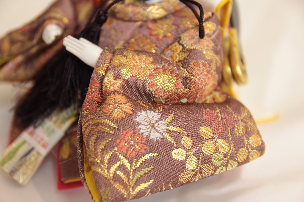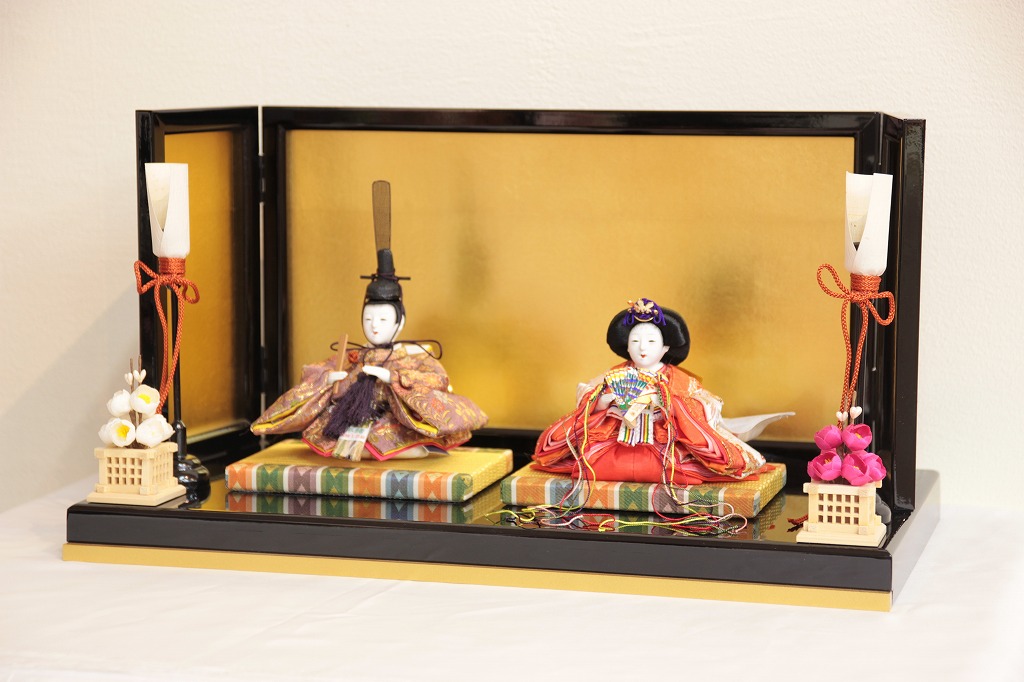 天然素材を使用した温かみのあるお顔に鮮やかな西陣織の衣裳、金色の古典的な屏風もセットになりました。