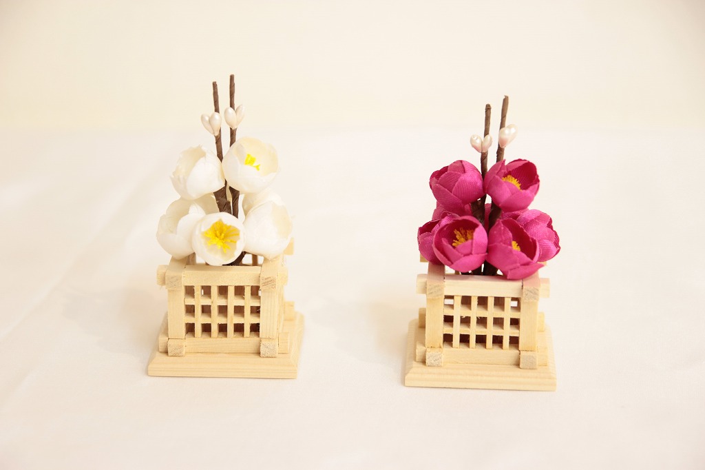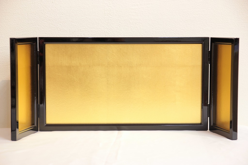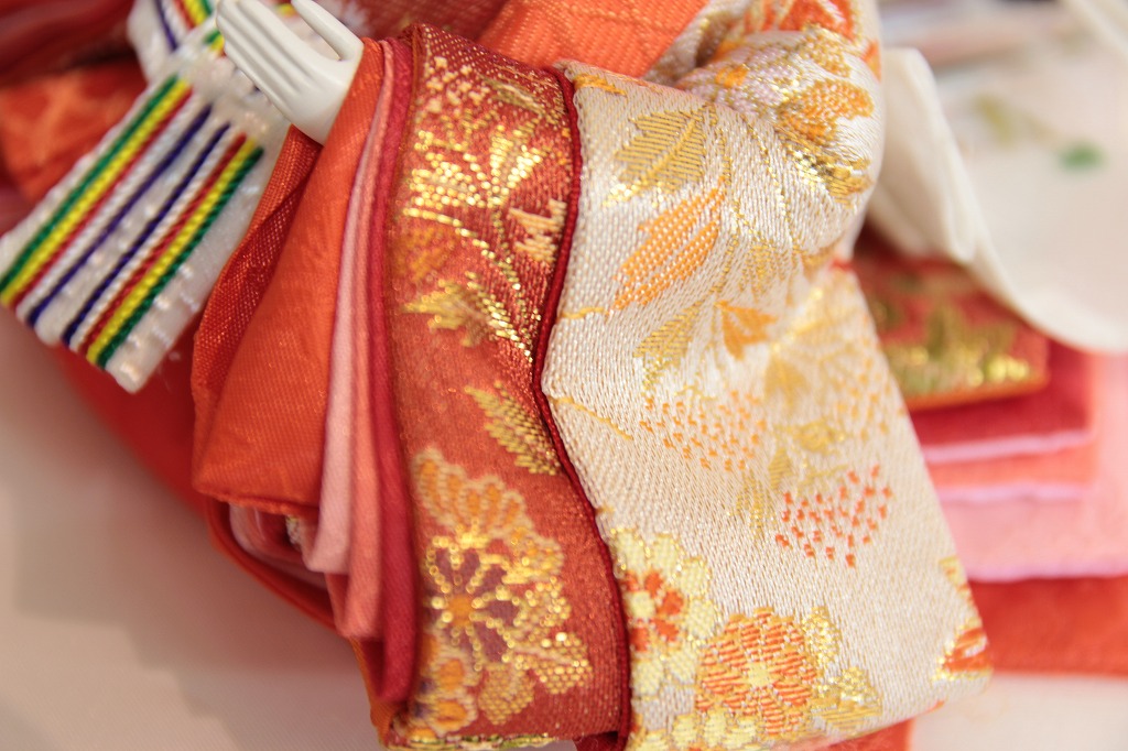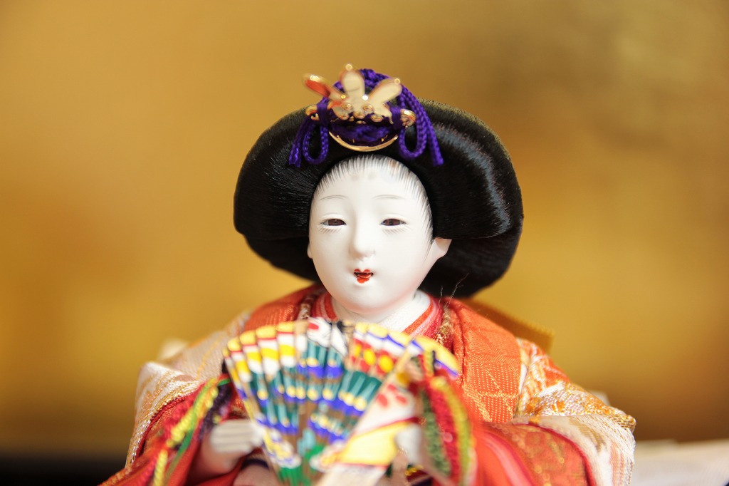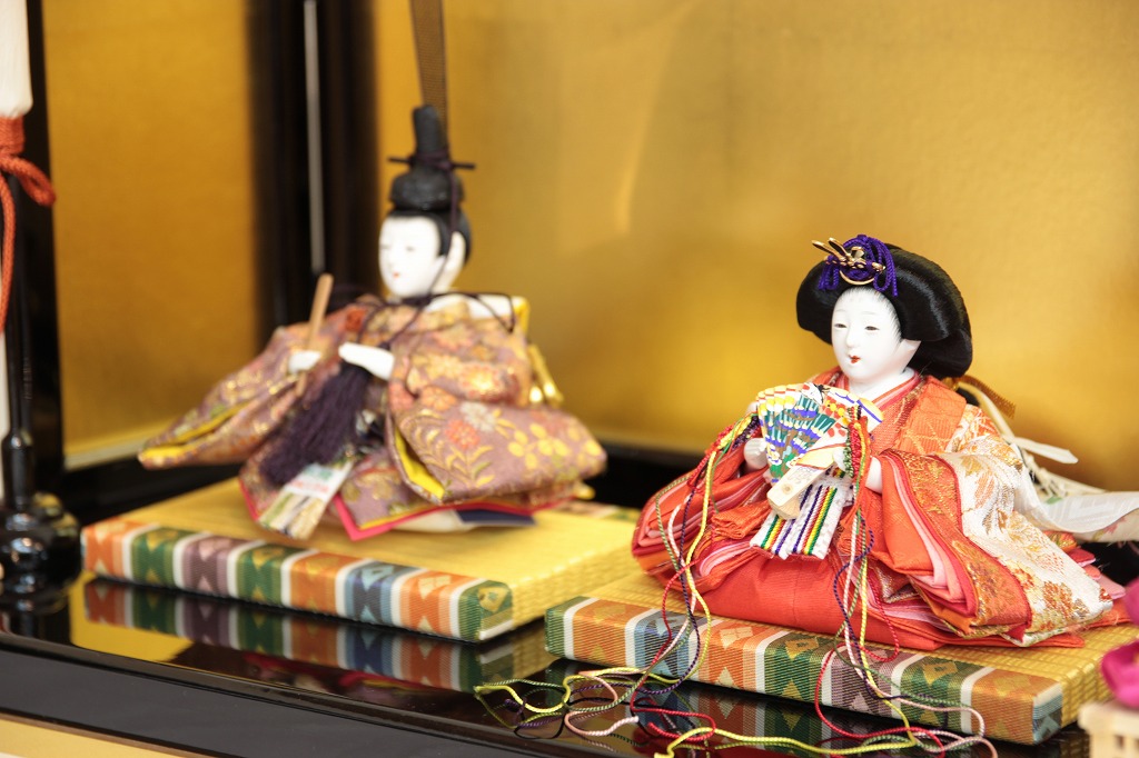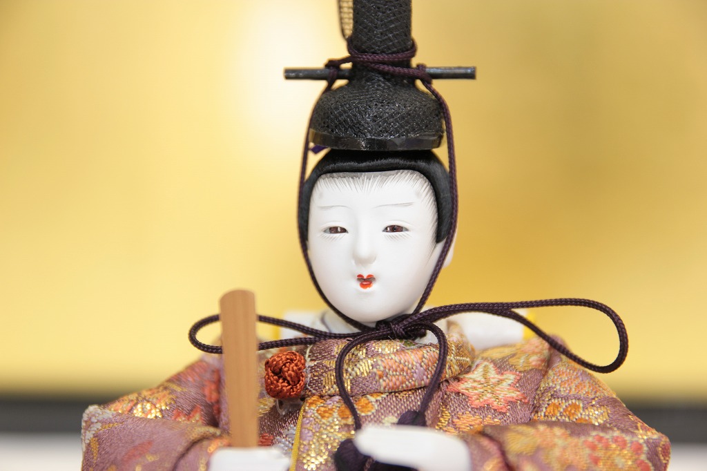 天然素材を使用した温かみのあるお顔に鮮やかな西陣織の衣裳、金色の古典的な屏風もセットになりました。